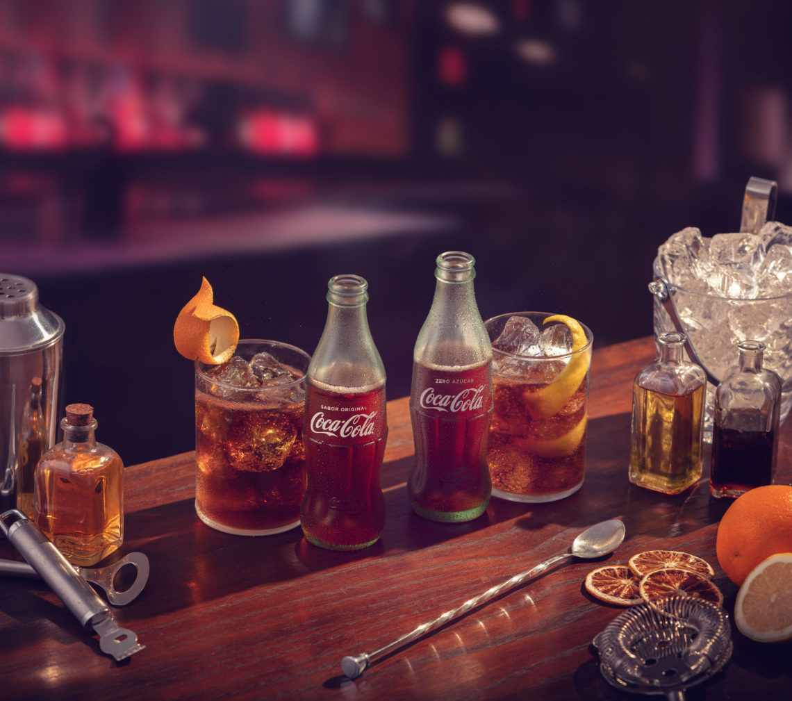 4. Añade una Coca-Cola bien fría y aromatiza el cóctel con un twist de lima.